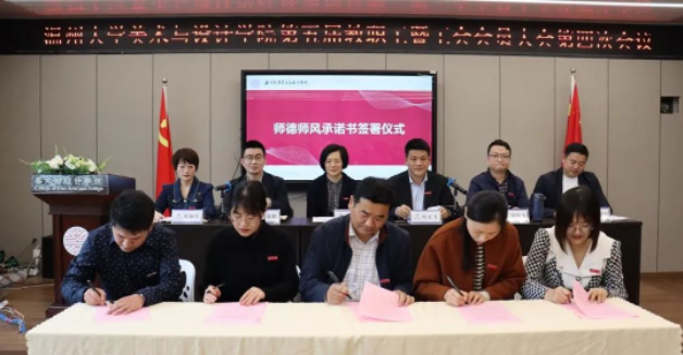 随后,学院为新入职教师举行了隆重的入职仪式。谢子静院长为新教师赠送入职礼盒、佩戴校徽,为指导教师们颁发聘书。同时,新入职教师签署了师德师风承诺书。