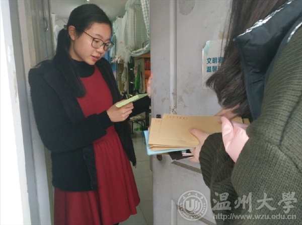 2016年12月28日,pg电子官方网站“艺家人”青年志愿者协会在超豪学区开展了弘扬“雷锋”精神的“爱心邮递”活动。 在数字化信息化的时代,人们似乎已经忘记了在通讯技术落后的年代里如何将情感用文字嵌入信中,并让它飘向远方,表达内心情感。此次活动号召通过以信件的方式写下对他人的祝福或者感谢,由志愿者们送到收件人的手中,正是对从前慢节奏的情感交流很好的体验。活动受到了广大同学们的一致好评,同学们纷纷将想说的话写在信纸上,在收齐信件后,小邮差们穿梭在各栋寝室楼内,他们轻叩房门微笑地送上手里的信件,并与收信人合影留念。 图/文:王伟