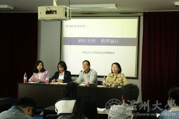 11月11日下午,2016风笛服饰全国高校巡回招聘会温大站于pg电子官方网站2B4001举行。风笛公司人力资源部经理吴朝晓出席此次会议,pg电子官方网站总支副书记杨振海、学生科副科长叶筱卉和2017届毕业生参加本次会议。
