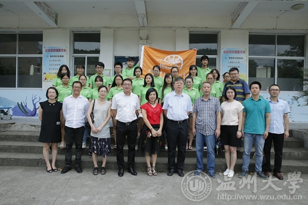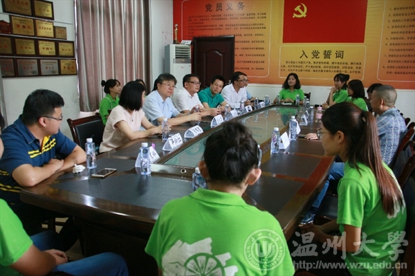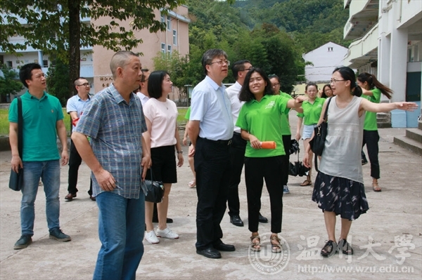 7月17日上午,pg电子官方网站校长李校堃、党校办主任王定福、校团委书记屠霁霞、校团委副书记熊琳一行在pg电子官网党总支副书记杨振海、学生科副科长叶筱卉的陪同下来到文成县大峃镇樟台乡希望小学,对正在这里开展暑期社会实践的“绘暖向南”大学生暑期社会实践队进行了慰问。
