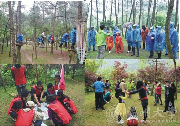 上午10点大巴车准时到达了位于楠溪江畔的永嘉书院景区。春雨迷蒙中,远山近水烟云缭绕,大家不由赞叹大自然春色的美好。在素拓教练的带领下老师们沿江岸前行,来到了林中的素拓基地。首先,在教练的指引下通过富于趣味性的小游戏完成了热身运动,也使得在平日紧张严肃的高校工作中紧绷的神经得到放松。然后,教练带领大家进行“丛林穿越”素质拓展项目,这是一项非常全面地锻炼人的肢体力量、平衡感和手脚协调性的运动。仅靠腰间一条保险绳,在离地两米高的木栈道、绳网、甚至钢丝纤上攀爬行进,看似容易其实费力而艰难,到了后半程很多稍年长的老师都体力大幅消耗汗流浃背,但大家都咬牙坚持拼力前行,一个小时内先后到达了终点。大家纷纷感叹,这不仅可以强身健体也是对意志力品质的很好锻炼。