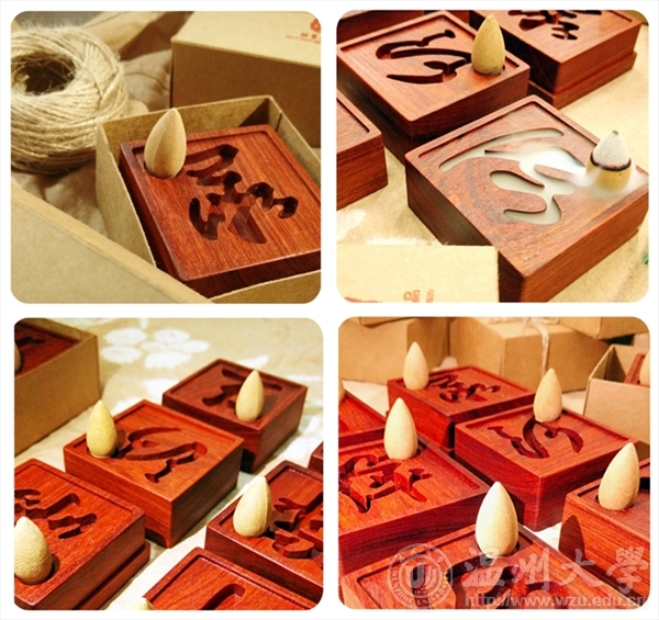 (熏香台,产品设计专业学生团队的文创产品之一。设计来源于中国文化汉字,将汉字雕刻融与红檀木之中。)