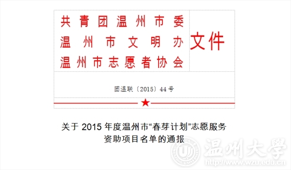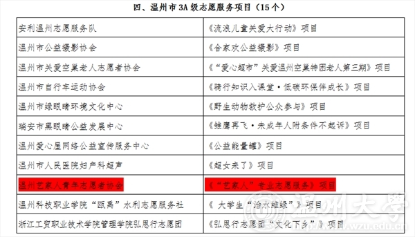 2015年12月12日,在温州市“春芽计划”志愿服务资助项目名单上,pg电子官方网站“艺家人”青年志愿者协会荣获pg电子官方网站唯一一个3A级项目,即温州市“春芽计划”3A级志愿者服务项目。