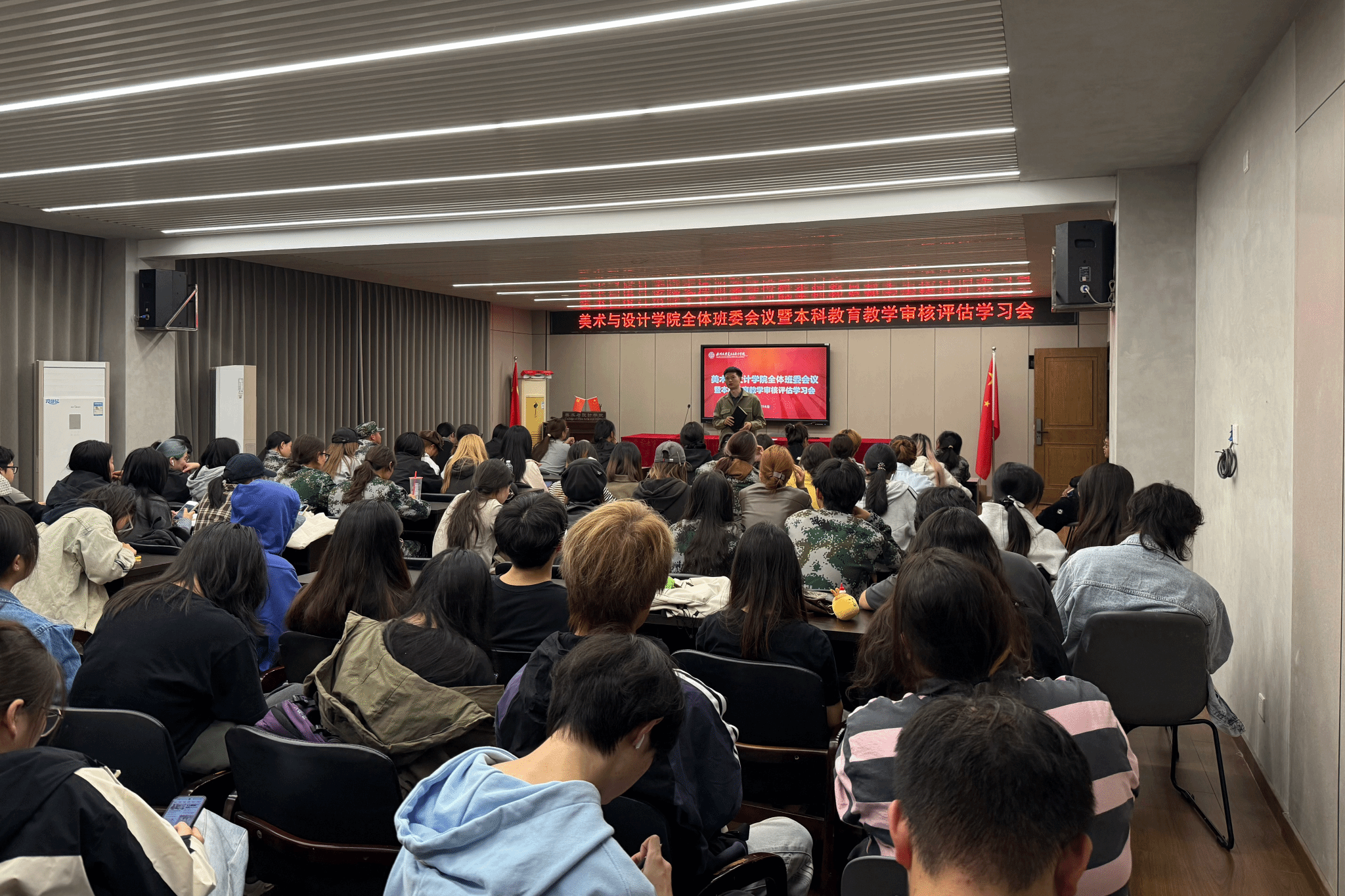 为深入配合学校本科教育教学审核评估工作,进一步加强学生骨干队伍建设,pg电子官方网站于2025年10月15日下午在2B4001会议室组织召开了全体班委会议暨本科教育教学审核评估学习会。学院学工办副主任杨永利老师出席会议,各年级全体班委参加。会议重点围绕本科教育教学审核评估的应知应会内容展开学习。杨永利老师详细解读了评估工作的基本理念、重点内容和相关要求,阐述了评估对学校和学院发展的重要意义,要求全体班委带头领会精神,并在同学中做好宣传和引导工作,营造人人关心评估、人人参与评估的良好氛围。此外,杨老师还进一步对上课考勤、教室卫生等日常管理工作提出要求,以严明的纪律和整洁的环境夯实学风建设,展现美院学子良好的精神风貌和学院的整体形象。此次会议的召开,不仅强化了学生骨干队伍的凝聚力和执行力,也使全体班委对本科教育教学审核评估工作有了更清晰、更深入的认识。班委们纷纷表示,将积极传达会议精神,以身作则,带领全班同学以高度的责任感和实际行动,为学校本科教育教学审核评估工作的顺利推进贡献自己的力量。