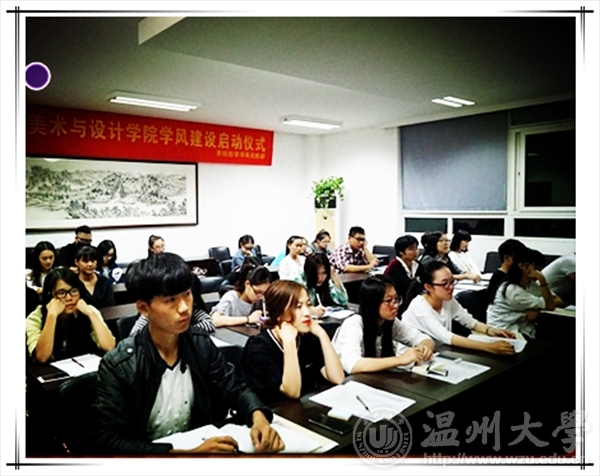 2015年9月22日晚上,pg电子官方网站学风纪检部在美院2B4001成功召开了“迎评促建pg电子官方网站学风建设启动仪式”。本次活动邀请了pg电子官方网站学生科科长叶筱卉老师,学院辅导员于静老师,五班代表13服设3班的何奕彬学姐,十星代表学习之星丁凯迪学姐以及超豪支部代表上官雯雯。 首先,本次会议由叶筱卉老师向同学们进行致辞。叶老师以自己的切身经历向同学们讲述了自己刚来温大美院时治理美院学风纪检的方法,又以“三叶草理论”和“政审”一词提出了学风纪检对学生的重要性,也让同学们了解到学风纪检工作的意义,并寄言“希望每个同学都能找到学习的积极性以及投身到学风纪检中来。”之后学风纪检部的副部长沈宇烽表述了十月份以后的考勤活动;辅导员于静老师对“五班十星”的评选办法进行说明,下面发言的丁凯迪学姐以“功夫不负有心人”劝解学弟学妹们,何奕彬学姐则是以“一切以班级荣誉为第一目标”的班规经验分享给大家。 其次,是问题交流环节,在坐的班干部积极提出了自己的疑惑,各嘉宾也都从各方面对同学们的问题进行了解答。 最后,会议在叶筱卉老师的总结和对同学们的建议圆满结束。本次“迎评促建pg电子官方网站学风建设启动仪式”向各班代表传达了五班十星评比的各项内容,让同学们也了解到学风建设的重要性和必须性,同时也意识到建设良好的学风,积极营造优良的校风,以饱满的热情和积极向上的精神风貌迎接2015-2016学年以“关心教学、关爱学生、规范管理、提升质量”为主题的学院学风建设年需要我们大家共同努力,也是我们每一个美院学子的责任和义务。