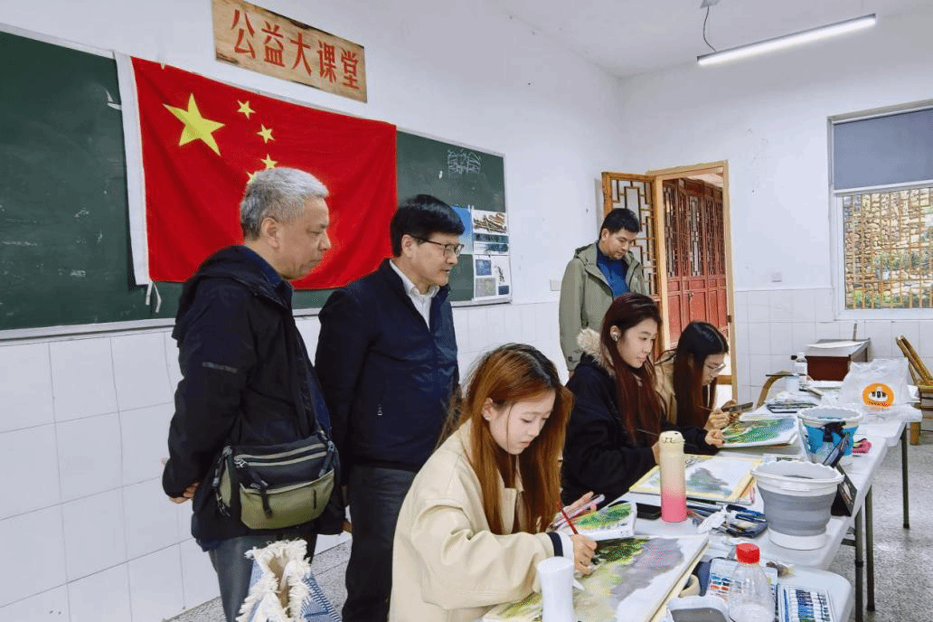 刘青松书记一行深入学生宿舍、食堂及写生现场,详细了解学生食宿保障、教学安排等情况。在写生现场,仔细观摩学生习作,与李利民、许学民等指导教师交流教学进度。刘青松书记叮嘱同学们在感受古村文化与自然之美的同时,更要时刻绷紧安全弦,遵守基地管理规定,确保户外写生安全。