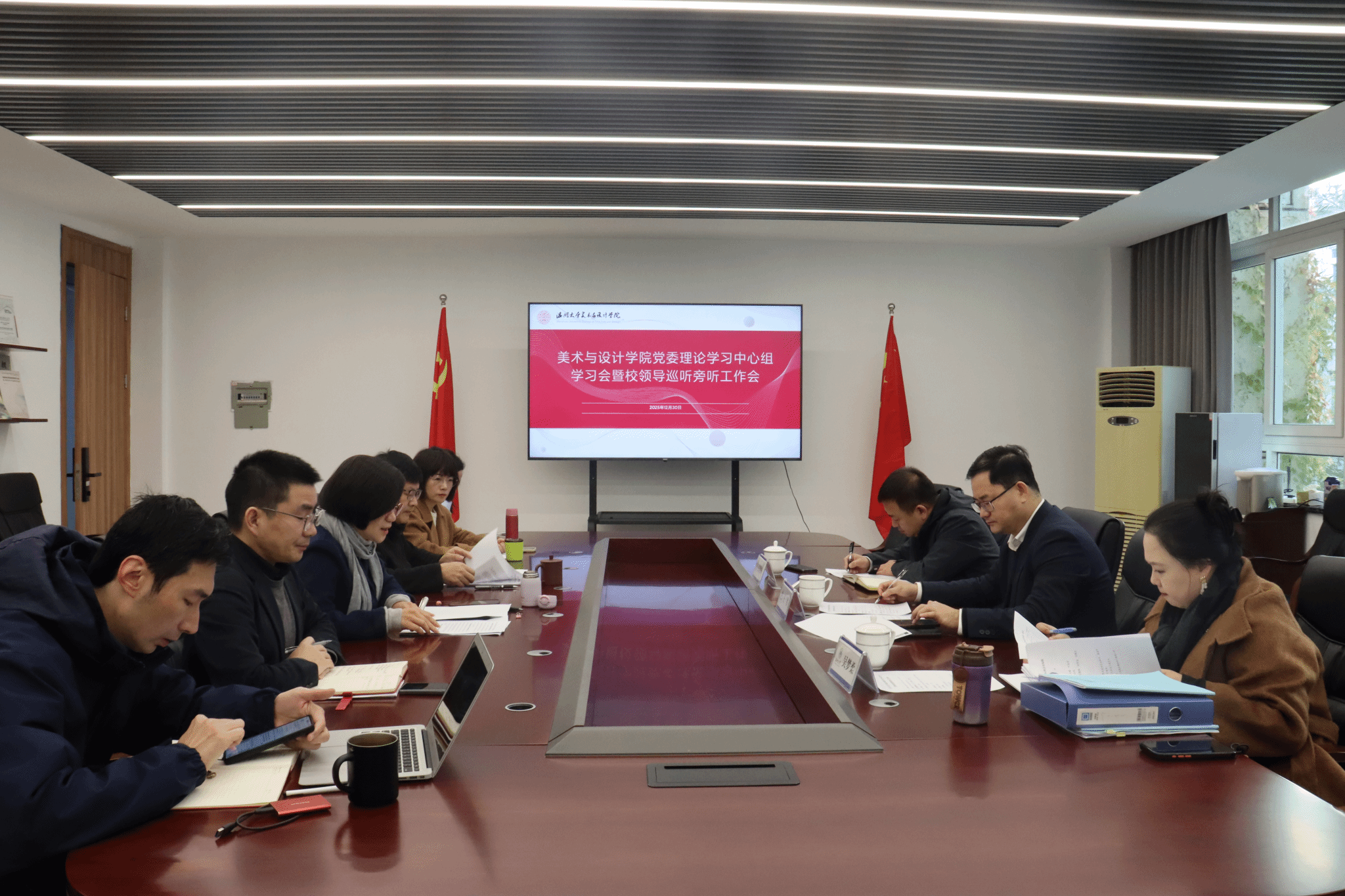2025年12月30日上午,pg电子官方网站党委理论学习中心组在学院2B216会议室召开专题学习会,深入学习贯彻党的二十届四中全会精神及新时代思想政治工作相关要求。校领导王军副校长率巡听旁听组全程指导,学院党委理论学习中心组成员出席会议,刘青松主持会议。会上,谢子静院长领学习近平总书记考察广东重要讲话精神及温州市委十三届九次全体(扩大)会议精神。她结合学院实际,从深化系统性改革激发内生动力、以高水平开放拓展发展空间、以高质量育人坚守初心使命三个维度,阐述了学院对接国家战略与地方发展的实践路径,强调要推动艺术与数字科技、人工智能深度融合,助力温州文化强市与生态强市建设。随后,刘青松领学《中国共产党思想政治工作条例》等内容,系统解读了条例出台的时代背景、核心定位与四大核心问题框架,明确了思想政治工作“是什么、谁来做、做什么、怎么做”的关键要义,指出条例为学院开展思想政治工作提供了根本遵循,要切实将其融入教育教学全过程。交流发言环节,中心组成员围绕学习主题,结合分管工作谈认识、讲体会。大家一致认为,要将党的二十届四中全会精神转化为推动学院发展的具体行动,聚焦学科专业优化、人才培养质量提升、产学研融合等重点工作;同时要立足艺术学科特色,创新思想政治工作方法,强化课程思政建设,培育德艺双馨的艺术人才。王军副校长对本次学习会给予充分肯定,认为会议准备充分、研讨深入、联系实际紧密。他结合学院发展现状提出要求,强调要精准谋划“十五五”发展规划,聚焦核心专业发展,集中资源打造特色亮点;要健全制度体系,以科学评价机制激发师生活力;要立足温州产业特色,推动美育与设计高质量协同发展,提升服务地方发展的能力与贡献度。(初审:张珈瑜,复审:黄旭红,终审:刘青松)