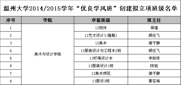 在pg电子官方网站2014-2015学年“优良学风班”创建立项申报中,pg电子官网各班级积极参与,踊跃申报。最终有8个班级立项成功,使美术学院成为本学年pg电子官方网站“优良学风班”创建立项班级数最多的学院。希望成功立项的班级班委对照创建方案和目标,广泛动员每一位学生积极参与到优良学风班的创建中来,确保立项目标的实现,争取在下学年取得“优良学风班”荣誉称号。班级名单如下:
