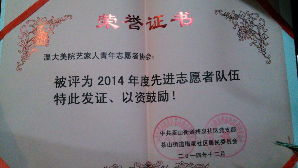 9点50分,志愿者表彰大会正式开始,首先是梅泉居委会为志愿者带来的一段小短片,为志愿者回顾了2014年以来的志愿者活动。丰富多彩的社区生活,快乐充实的志愿者活动......社区委员对各个志愿者团队进行颁奖,pg电子官网“艺家人”青年志愿者协会被评为“2014年度先进志愿者队伍”,这也是对我们“载梦小舟”支教的志愿者们这一年来辛苦付出的肯定。随后,各获奖志愿者团队代表一一上台发言,pg电子官网“载梦小舟”负责人代表张静同学也上台作了发言,总结“载梦小舟”这一年来的感想,对志愿者表达了由衷的感谢,对一直支持的社区负责人和家长,以及可爱的小朋友们表示感谢。最后,在梅泉社区居委会委员鲁建晓女士的演讲下,本次志愿者表彰大会圆满划上了句号。