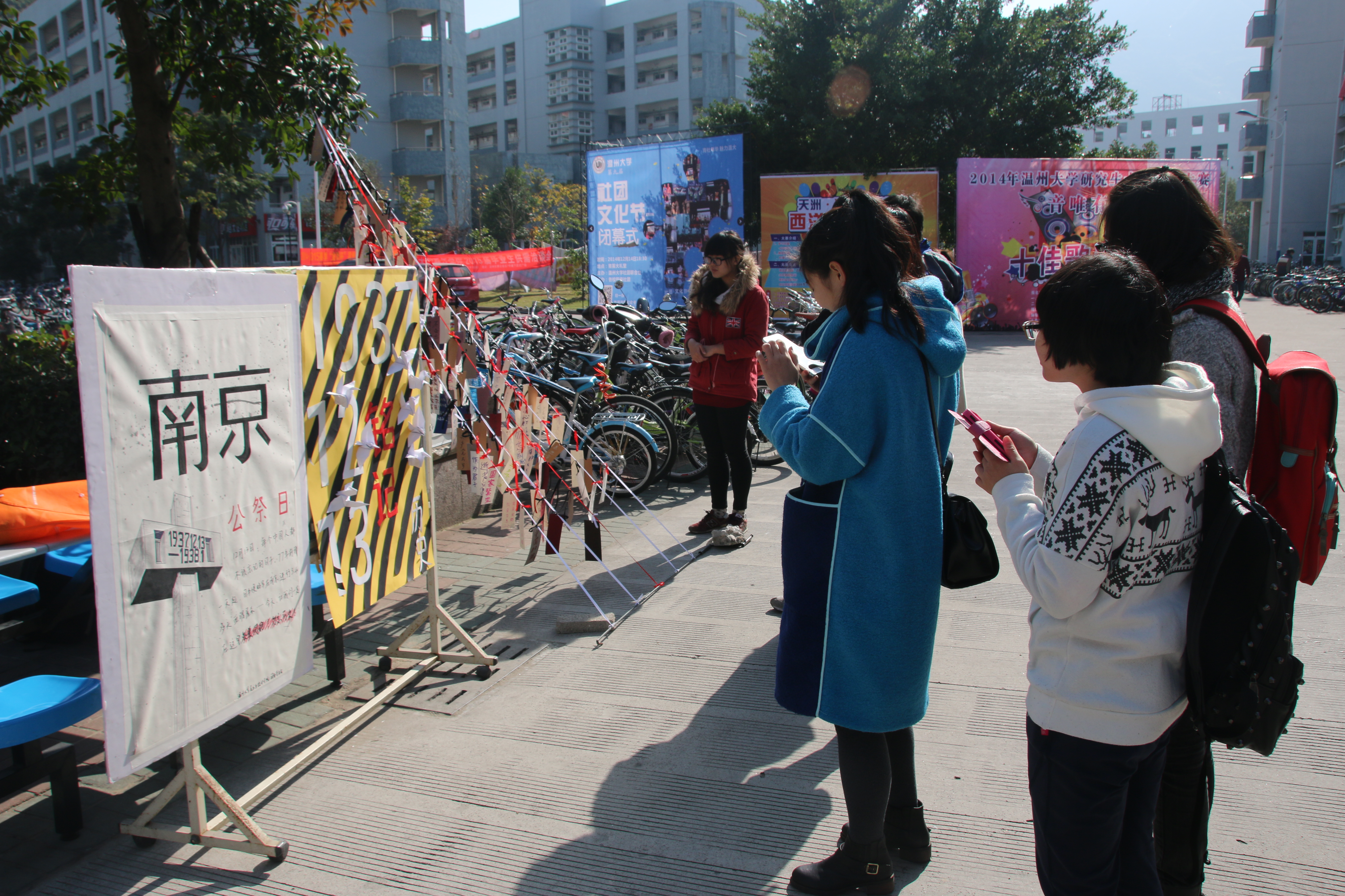 12月13日当天,pg电子官方网站团委学生会创业就业部与学风纪检部为响应本次国家公祭日,在超豪学区开展举办了祭语公祭悼念活动。本次活动展出了两张手绘悼念大海报及多张手绘宣传公祭漫画,同时开展了温大学子亲手写寄语、挂祭语活动。一同为南京大屠杀遇难人民哀悼,缅怀抗日先烈,勿忘国耻,铭记历史。 记住历史,但不要记住仇恨; 可以原谅,但绝不可以遗忘; 让白骨可以入睡,让冤魂能够安眠 把屠刀化铸警钟,把逝名刻作史鉴; 让孩童不再惊恐,让母亲不再凄叹 让战争远离人类,让和平洒满人间; 让我们以国家的名义,祭奠死难同胞! (通讯员:沈宇烽,摄影:张昇)