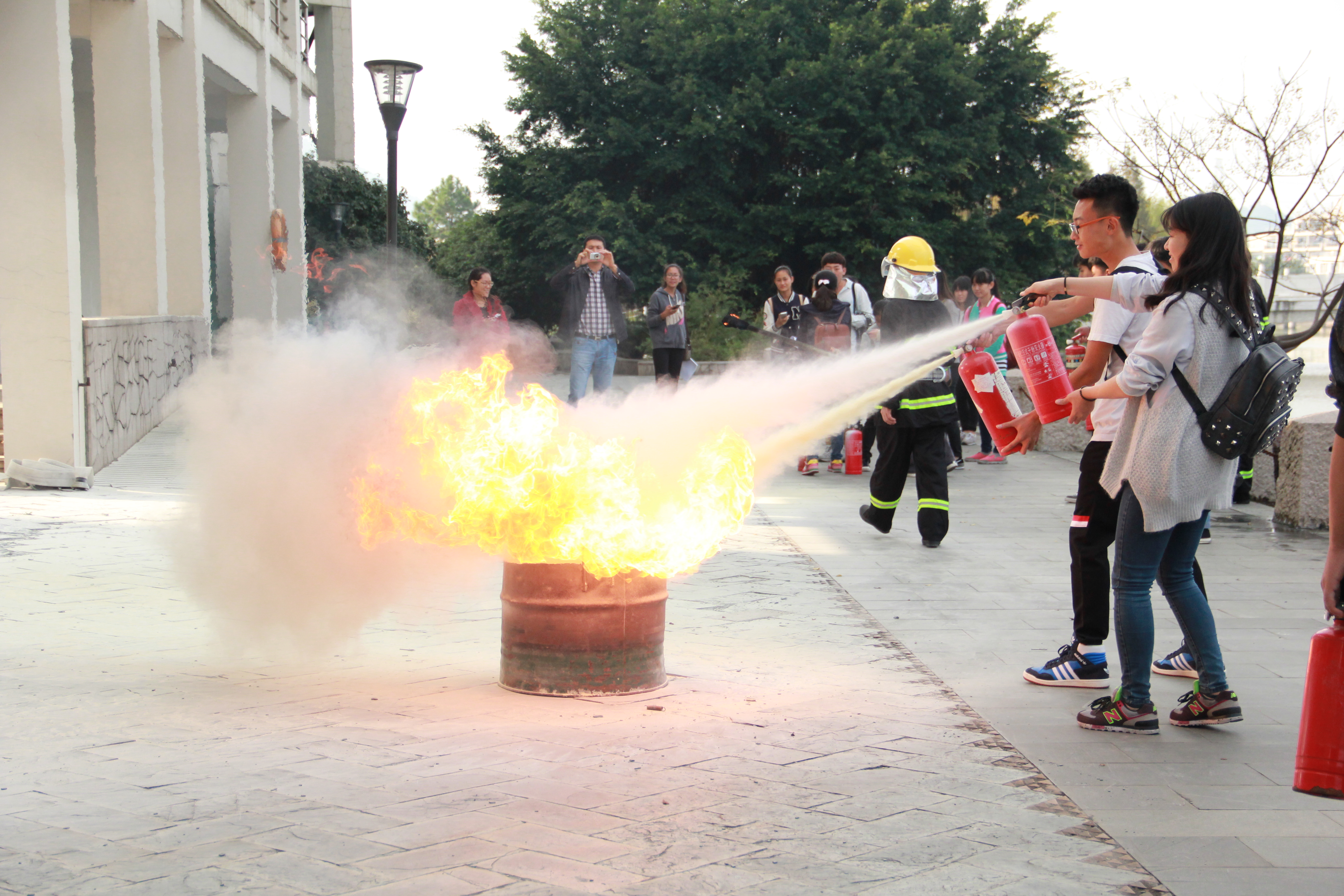 下午两点,活动在我院侧门正式开始。首先,邵伟波老师给同学们详细地介绍有关消防安全的知识,火灾的起因及火灾在初起、发展和熄灭三个阶段应采取的相应措施,并打开消防箱,教大家在危机时刻该如何给学校消防科报警,如何拼接消防对接口,正确的利用好就近资源解决当前危机。特别强调了当火灾发生后的心态和应对方法,随后我们在专业消防团队的组织下用灭火器进行了真实的灭火演习。