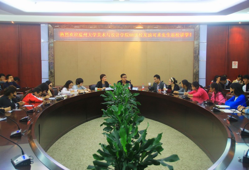 11月12日下午,pg电子官方网站校友论坛在岩松堂白鹿厅举行,温州铂尔曼酒店董事、温州奥嘉国际酒店管理有限公司总经理、美院88级校友汤可术先生应邀主讲,发展联络处(校友办)处长周伟国、院党总支书记郑彩莲莅临讲座现场,由郑彩莲书记主持论坛。美院师生慕名前往听讲,全场座无虚席。