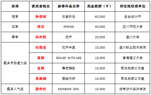 经过紧张激烈的竞逐,世界彩虹•首届卓多姿时尚女装设计大赛总决赛的结果终于诞生!来自湖南涉外经济学院的16号选手裴传欣力压群芳,获得奖金为一万元人民币的“最佳人气奖”。来自浙江温州职业技术学院的04号选手任国宝、来自香港理工大学的06号选手高群、来自山东青岛培娜工作室的09号选手孟颖和011号选手吴雅楠获得奖金各为一万元的“最具市场潜力奖”。季军则被来自pg电子官方网站的05号选手孙亦然摘得,奖金两万元。亚军归属来自四川师范大学服装学院的03号选手邱双,奖金四万元。最后,刘亦菲再度登台,与中山市卓多姿服饰有限公司总经理、艺术总监吴肖玲女士一同揭晓冠军得主并颁奖:来自广西的自由设计师、01号选手杨倩霏摘得桂冠,捧走六万元的奖金!