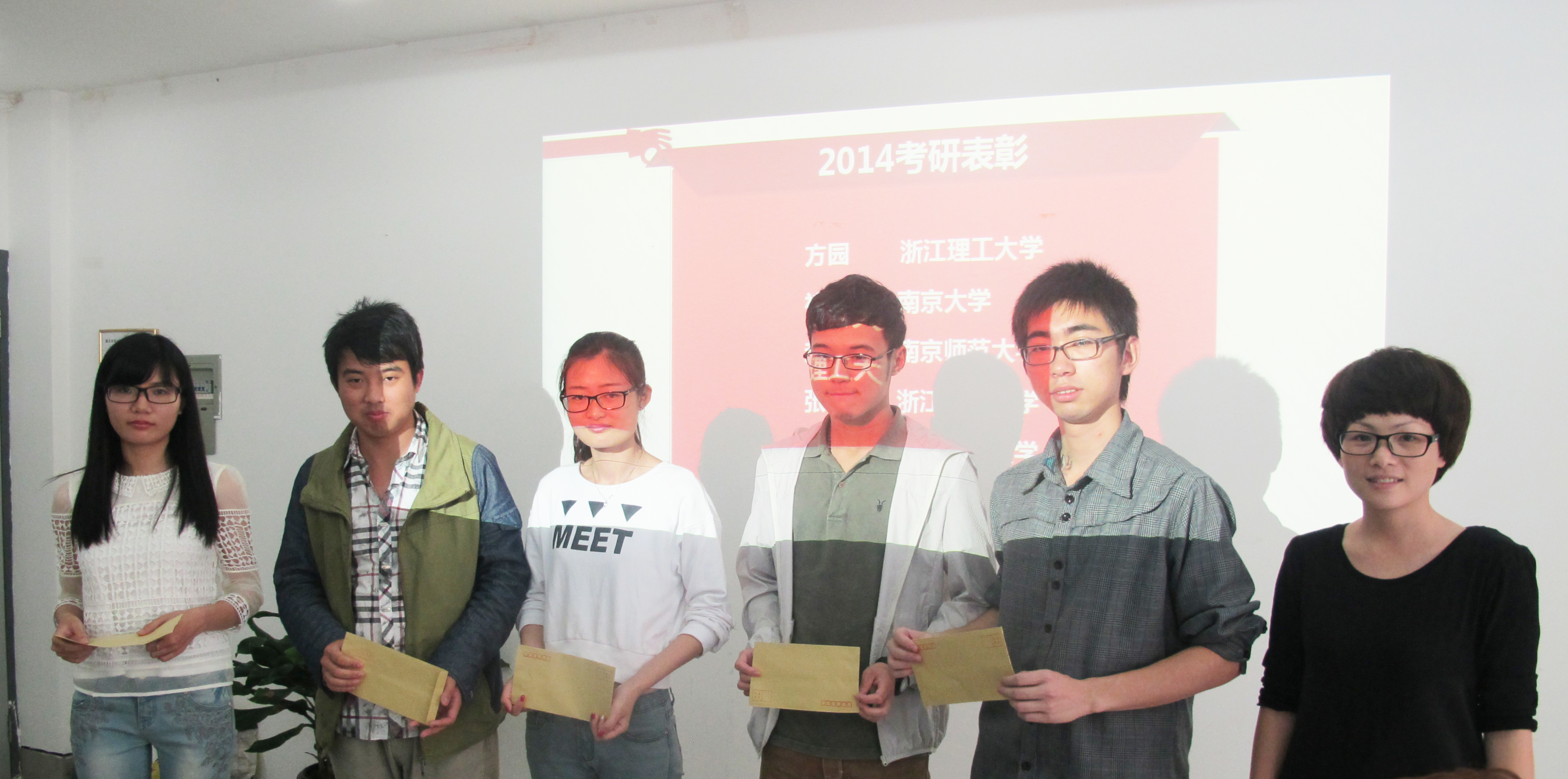 叶老师首先对pg电子官网2014年国内考研成功录取的美本师范班褚明敏、服装设计与工程班方圆、环境艺术设计班赵锦程、美本班张伟佳、服装设计班邬仁亚,和国外考研成功录取的环境艺术设计班袁炜楠、平面设计班李奕璠、鞋靴设计班魏子八位同学进行了表彰仪式,并颁发了学院奖金。叶老师讲到,考研经验交流会让在座的每位同学能够真切、直观、详实地体会考研路上的辛苦与喜悦,相信在知识道路上坚持的同学们都会收获更好的自己!
