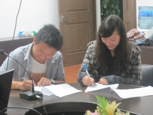 接着是启动仪式的重要环节,结对双方签订服务协议。07鞋靴毕业生代表和支部党员代表在仔细阅读协议后,签定了协议并交换了协议书以示结对活动正式生效。为活跃会场气氛,增进党员与毕业生之间的情谊,仪式中举行了诗歌朗诵、猜词等活动,大家在欢笑中共聚时光。最后,双方互写赠言,传递祝福和希冀。