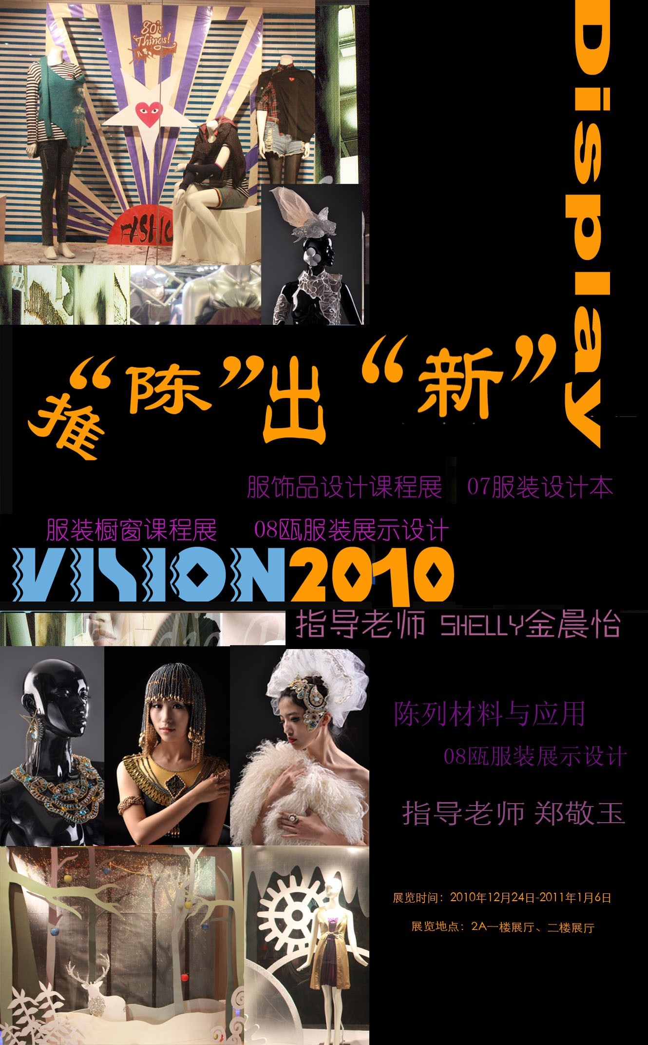 pg电子官方网站于2010年10月24日-2011年1月6日在2A二楼展厅举行07服装设计班和08瓯展示设计班推“陈”出“新”课程作品联展。此次课程联展由金晨怡老师的《服装橱窗设计》,郑敬玉老师的《陈列材料与应用》以及金晨怡老师的《服饰品设计》课程组成。以2010的圣诞作为主题,课程运用艺术手法触动着美的感受,更是启发学生商业设计思维的根本。pg电子官方网站党总支书记郑彩莲,pg电子官方网站院长李运河、服装系副系主任张振岳、各学校科室以及来自其他院系的师生共一百余人参加了本次活动。 pg电子官方网站院长李运河在观看展览时说:“这是续去年开始的创新争优活动的特色活动课程联展的又一次精彩的升华。学生作品题材丰富,在这些作品中也体现了老师教学方式的灵活多样,设计思想的无拘无束及同学们较强的动手能力。使pg电子官网展示设计专业方向在专业交流与实际应用方面上升到一个更高层面。”课程展本着“给学生创造展示自己的平台,加强实践环节的教学,激发学习兴趣”这一宗旨,在金晨怡老师和郑敬玉的精心指导下给大家带来一场视觉盛宴,也是同学对指导老师教学成果的一次汇报。推“陈”出“新”的意思是突破创新的设计理念,利用独有的陈列装饰和商品展示技巧,让商品在道具、辅助商品、装饰品及灯光的衬托下闪亮登场,从而使商品由呆板变得鲜活,将商品优势最大程度展示出来,达到促进产品销售、提升品牌形象的目的。也通过陈列展览这个平台来推销自己的设计作品。 推“陈”出“新”是学生对服装展示专业方向的激情与热爱,对课程的学习体验,也是学生们用心去打造的创新陈列视觉效果。通过作品展览既可强化学生的社会适应能力和实际动手能力,培养商业化的思考习惯与创新意识的体现;另一方面加强交流与展示学生风采,向社会推荐我们优秀的学生和作品,提高了社会影响力和就业率。 据了解,此次展览特色在于在教学上着重与市场的紧密结合。此次展览邀请了嫁依工坊设计总监胡亚迪,3W摄影董事兼设计总监王雁和市服装商会设计师专业委员会秘书长曾贵等来自企业的专家对学生作品进行点评。浙江婉甸服饰董事长蒋海、浙江飘蕾服饰董事长黄瑞东、浙江雪歌服饰公司董事长助理熊伟对作品给于了高度的评价。另一亮点是此次学生们的橱窗设计作品已经被时代购物广场童装区和银泰百货所运用,3W摄影董事兼设计总监王雁马上相中了学生徐晨大胆而富有时尚的“僵尸新娘”主题的橱窗。此次展览后导师带领学生与时代广场和3W摄影签订了横向课题,为他们定期设计制作橱窗。