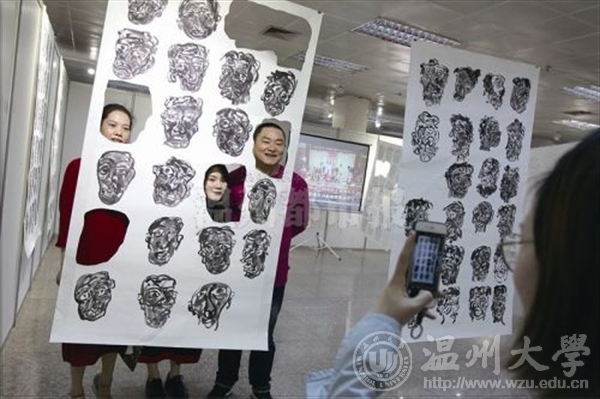 昨天上午,pg电子官方网站2017届毕业作品展在温州市展览馆开幕,参观者与美术作品合影。