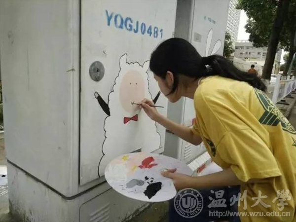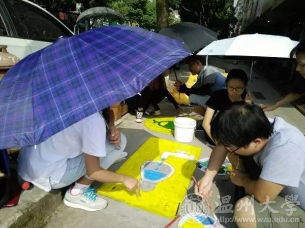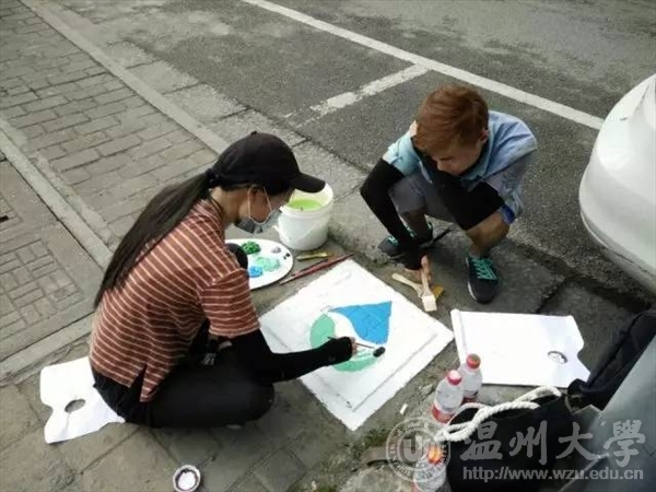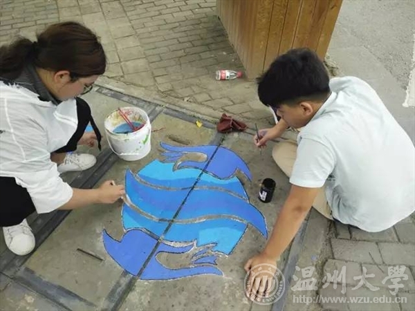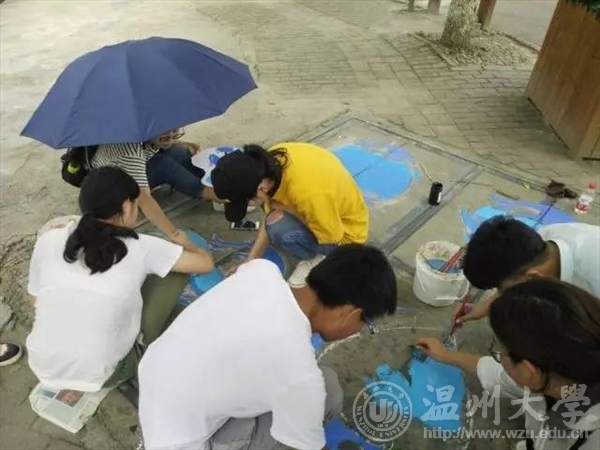 如果说青春是一首待谱的乐曲我愿与你一起演奏也许我们的青春没有那么多的华丽瞬间但这个夏天我们做了一件非常有意义的事艺绘,一起为城市文明添砖加瓦!五水共治,我们绘制2017年7月6日乐清市晨曦路 活动介绍:近年来环境问题越来越受到人们的关注,乐清市路政部门也非常重视保护环境,打出了''五水共治''的口号。艺绘实践队也以保护水资源、爱护地球、五水共治为主线,开展绘画工作,旨在引起人们的注意:地球只有一个,保护地球,保护水资源迫在眉睫。 走进乐清彩绘,推进五水共治,扬我温大风采。五水共治,我们用心绘制。 迎着朝阳,顶着烈日,阳光下的你,虽然酷热难耐,但手中的画笔却从未停息,乐清的城市文明在你的画中飘然流露。成果展示our paintings 一幅幅美丽的画作展现在街道两旁的下水道井盖上,看到这些原本影响市容市貌的井盖成为了一道靓丽的风景,我们感觉到付出的汗水没有白费。