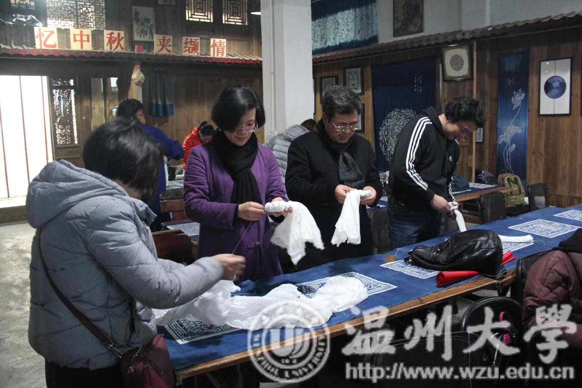 阳春三月,桃李芳菲。pg电子官方网站工会组织全院女教师赴温州市采成蓝夹缬博物馆,开展世界非物质文化遗产体验活动。 乡野间桃红柳绿油菜花黄,一路上的大家因美景而兴致高昂,谈笑风生欢声笑语洒满车厢。一小时后老师们到达了位于瑞安马屿净水村附近的一幢乌瓦白墙的江南民居式建筑——温州市采成蓝夹缬博物馆。这里山环水绕茂林修竹溪流淙淙,环境十分优美。 温州蓝夹缬技艺代表性传承人、采成蓝夹缬博物馆的王河生馆长热情地到门口迎接大家。在讲堂落座后,王馆长向老师们介绍了我国夹缬印染的历史发展、原料炼制、工艺流程等知识。大家了解到:夹缬印染工艺在我国有着非常悠久的历史,早在隋唐时期彩色夹缬就已十分兴盛;宋以后由于政治经济的因素,彩色夹缬衰落而蓝夹缬一枝独秀获得了长足发展,至明清已成为相当规模的产业;民国以后由于西方工业化印染技术的传入使用天然染料的传统手工印染业陷入困境,以致前些年蓝夹缬技艺在浙南趋于消亡。在党和政府的关怀下蓝夹缬技艺被列入“国家级非物质文化遗产”得到了保护和发展。“青出于蓝而胜于蓝”的传统蓝夹缬印染技艺焕发出了新的生机。 随后在王馆长的引导和讲解下,女老师们参观了博物馆的各个展厅,从明清到当代丰富的藏品为大家呈现出一个异彩纷呈的印染艺术世界。结核自己的美术和设计专业大家纷纷与王馆长互动探讨,气氛相当热烈。之后,老师们还观摩了用木雕版印染蓝夹缬的工艺流程。 最后,为对工艺加深了解,大家亲身实践,拿出布料棉线等材料,制作扎染和蜡染作品。绑、扎、缝、叠、裹……各种技法在美院女老师的一双双巧手中纷纷上阵,创造出一个个姿态各异的布品。再在靛蓝染缸里经过“三浸染三氧化”的染蓝工序,固色漂洗后,一件件花色多变千姿百态的印蓝丝巾呈现在大家面前迎风飘扬,博物馆里院子里立刻飘起了一道靓丽的风景线。老师们站在晾架前面对着各自创造的作品交流着心得体会,欢声笑语阵阵不断。 短短半日,老师们沉浸于传统染缬文化传递的历史美,在这盎然春日,至真至美的地方传统文化再次在寻访之人心中生根发芽,并将年复一年绽放于教书育人的一言一行。(文/图冀千里)
