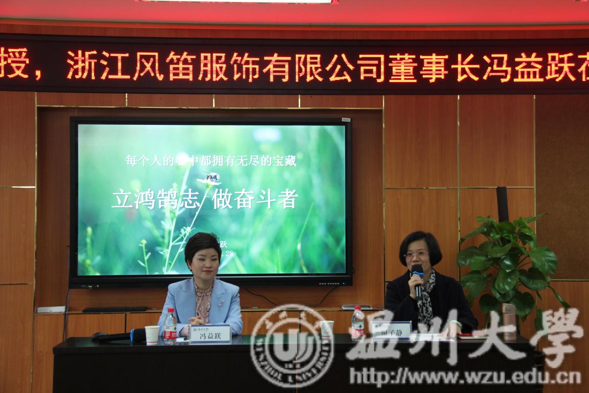 3月28日下午,我校客座教授、浙江风笛服饰有限公司董事长冯益跃女士莅临pg电子官网讲学,主题为《立鸿鹄志,做奋斗者》,学院院长李运河教授、副院长谢子静教授、学生科科长叶筱卉、服装与服饰设计教研室主任钟信群以及相关专业教师和学生参与观听,全场座无虚席。学院副院长谢子静教授主持。