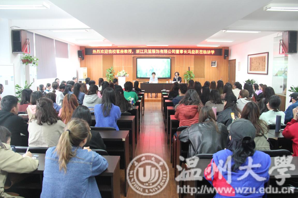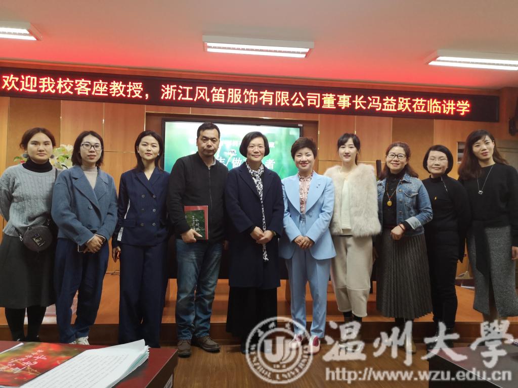 3月28日下午,我校客座教授、浙江风笛服饰有限公司董事长冯益跃女士莅临pg电子官网讲学,主题为《立鸿鹄志,做奋斗者》,学院院长李运河教授、副院长谢子静教授、学生科科长叶筱卉、服装与服饰设计教研室主任钟信群以及相关专业教师和学生参与观听,全场座无虚席。学院副院长谢子静教授主持。 讲座主要围绕心、道、德、事四个层次,分别讲述冯董自己个人的创业史以及有关励志教育,案例生动形象,内容深入浅出,她以平实亲和的语言教导在座的莘莘学子,要立鸿鹄志,勇做奋斗者。充分展现了一个无私无我、奉献社会的新时代成功企业家形象。 在为时两个半小时的讲座结束后,同学们热情不减,积极互动提问,作为我校客座教授的她均一一热情予以解答。会后,与会成员合影留念。