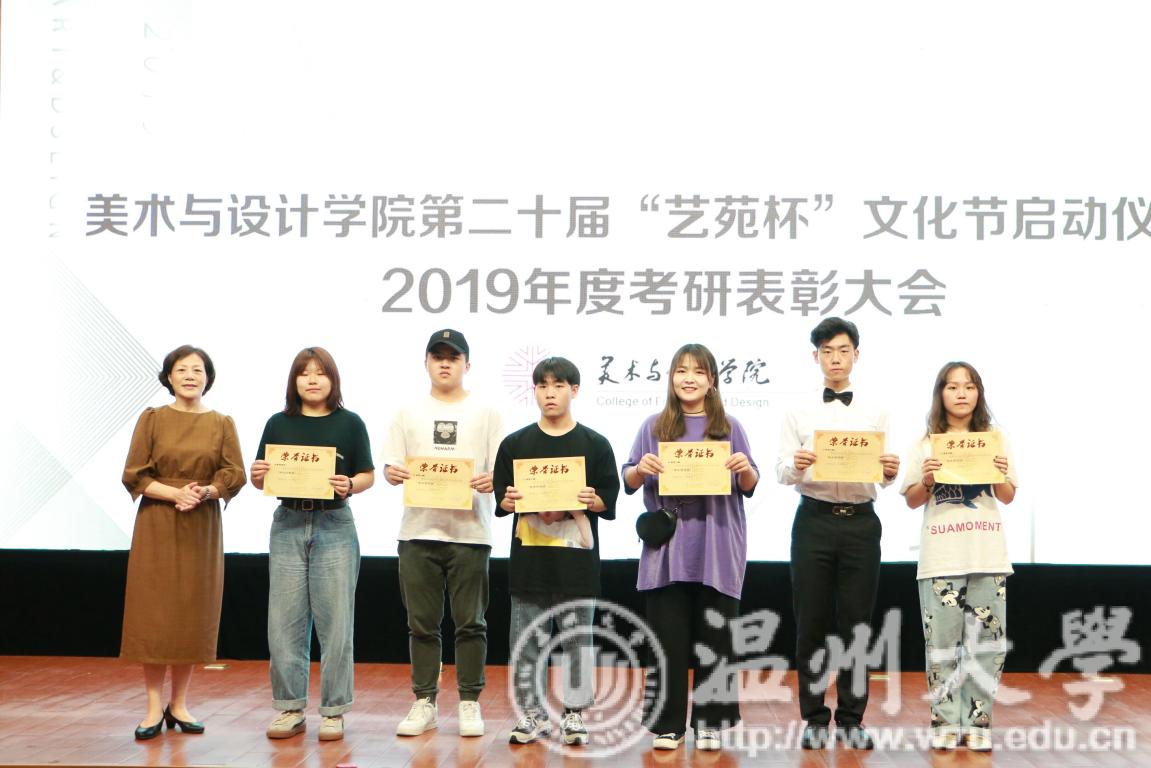 会议第二项议程是学风表彰。大会宣读了2018年度pg电子官方网站“五班十星”名单和2019年度pg电子官方网站“考研奖学金”获得者名单。2017-2018学年校级学习标兵陈晨,2019年度美院“考研奖学金”获得者代表15服工班杨怡洁、15美术学一班聂枭雄分别做学习和考研经验分享。2019年pg电子官方网站共有16人考取研究生,16人中有5人被浙江理工大学录取、6人被pg电子官方网站录取、1人被杭州师范大学录取,还有4人被国外的大学录取。与会领导为他们颁发了奖状和证书并合影留念。