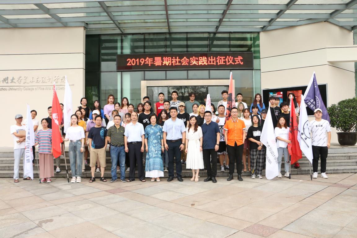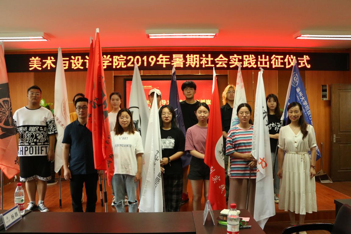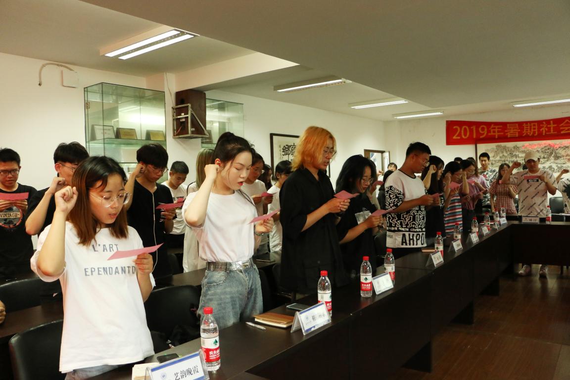 出征仪式全体宣誓,由2019年暑期社会实践学生代表崔泽渝领誓,全体同学宣誓,在庄严的誓词面前,同学们将更加坚定暑期社会实践的责任和信心。最后,学院领导为每个实践队授旗,本次活动也在美院正门的合照中,圆满画下了句号。