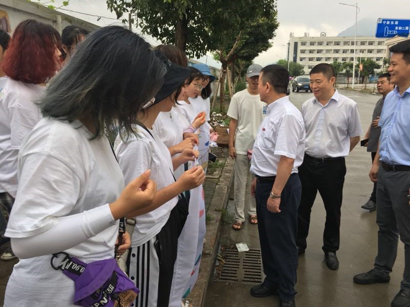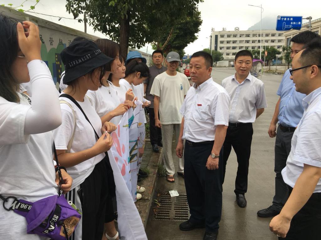 7月14日上午,pg电子官方网站党委书记谢树华,乐清市委常委、宣传部部长范晓东一行慰问正在乐清市宁康东路金海湾花苑附近开展“艺绘”暑期社会实践活动的pg电子官网师生,党校办主任蔡联群、pg电子官方网站党委书记叶正飞、副书记杨丽君、校团委副书记易招娣、副书记丁强、党校办督办科科长陈赞安、乐清市城东街道办事处相关同志陪同慰问。