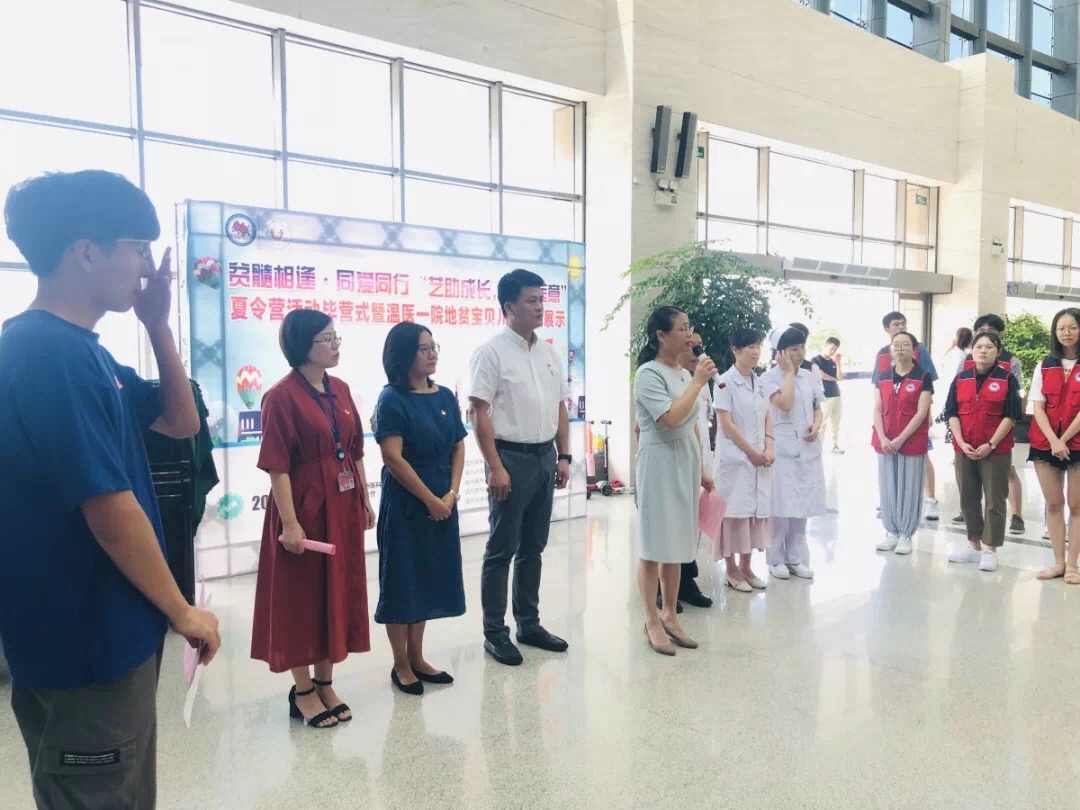 2019年7月23日上午,温州医科大学附属第一医院党委副书记金嵘;pg电子官方网站党委书记叶正飞;温州医科大学附属第一医院血液内科主任俞康;温州医科大学附属第一医院血液内科副主任、阳光地贫志愿队队长陈怡;温州医科大学附属第一医院团委专职副书记尚蕾蕾;pg电子官方网站学工办主任杨鹏;pg电子官方网站辅导员等人来到温州医科大学附属第一医院南大厅参加了“贫髓相逢 同爱同行”夏令营闭营仪式。