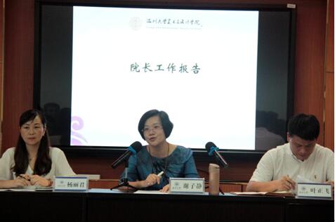 会上,院长谢子静作学院工作报告。谢子静院长总结新班子组建两个多月来开展的工作内容和取得的不俗成绩,明确学院要紧随学校建设“具有鲜明特色的高水平综合性教学研究型大学”办学定位的大方向,锚定“三大目标”、实施“七大跨越”,助力学校推动跨越发展。并从学校办学定位出发,结合学院十三五发展规划纲要,分析研究当前美院发展的实际和存在的短板问题,提出了pg电子官网建设具有有较强影响力、特色鲜明的省内一流教学科研型艺术学院的办学定位。新时期赋予新使命,新学期承载着新任务,新班子肩负着新担当,会上谢院长围绕加强本科教育、人才队伍建设、学科建设、服务地方、国际化办学、研究生教育、继续教育等方面整体部署了学院发展下一步的工作思路及措施,并希望全院上下同心同德,群策群力,既要激情满怀,又要齐心协力,脚踏实地、奋力拼博,为美院的新征程谱写新的篇章。