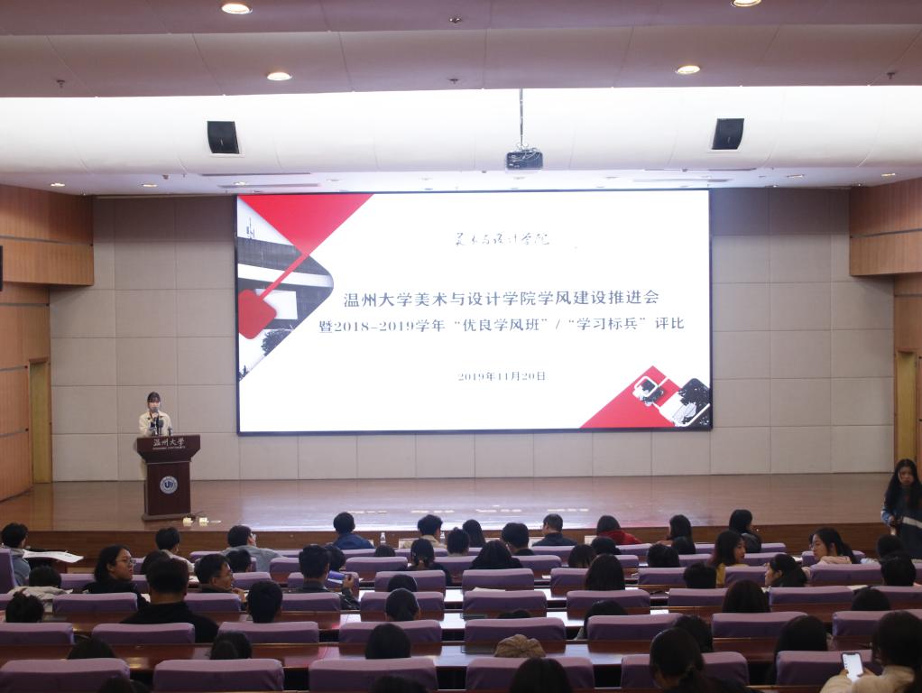 为加强美院学风建设,2019年11月20日晚,pg电子官方网站学风建设推进会暨2018-2019学年“优良学风班”和“学习标兵”评比活动于育英图书馆报告厅顺利举行。出席本次评比活动的评委有pg电子官方网站党委副书记杨丽君老师,学工办主任杨鹏老师,教学科阳自杰老师,辅导员杨永利老师,学生会主席祝晴同学以及各班学生评委。