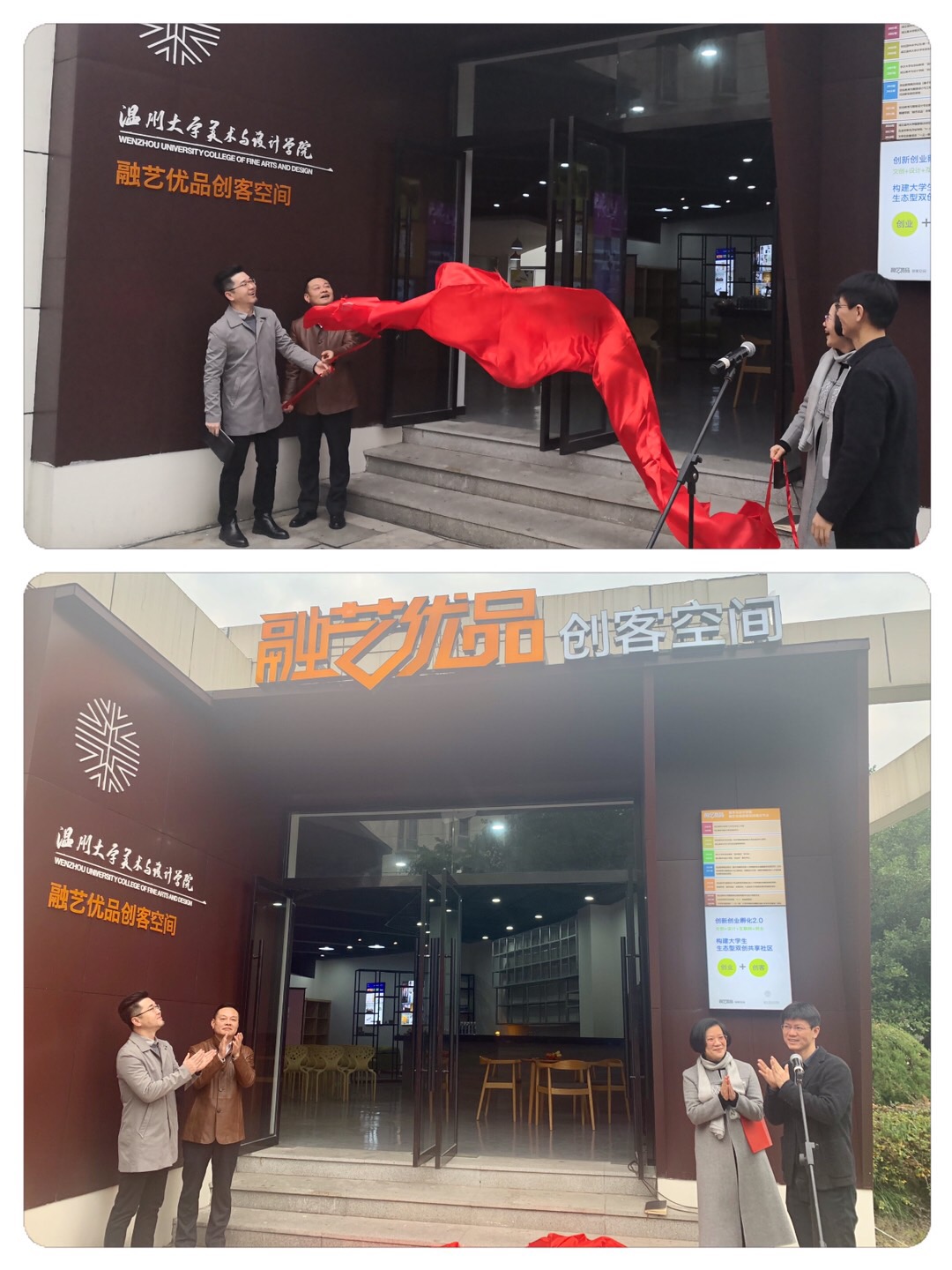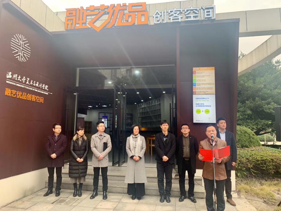 2020年1月3日上午,pg电子官方网站“融艺优品”创客空间揭牌仪式隆重举行。pg电子官方网站党委委员、宣传部部长潘玉驹、创新创业学院院长施永川,温州四目公司总经理张登峰、pg电子官方网站院长谢子静、党委书记叶正飞等院领导班子及入驻团队师生出席了揭牌仪式。