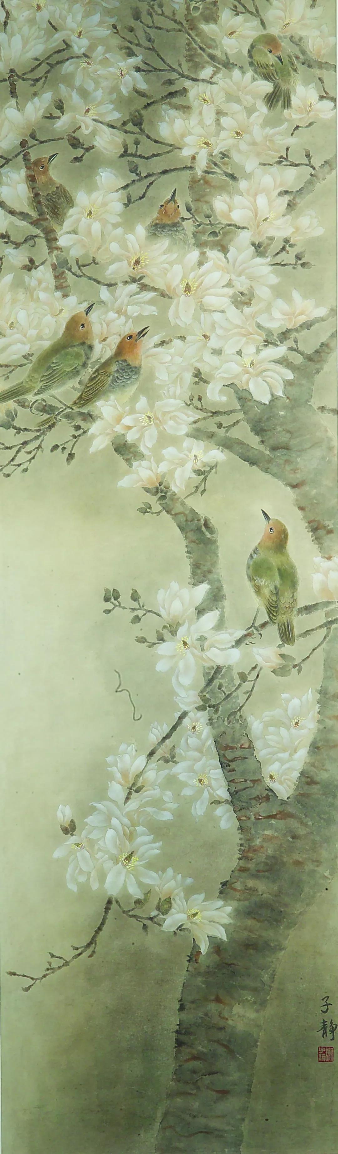 谢子静专攻中国花鸟画,对大自然的一花一鸟,一草一石均投以极大的热情与兴趣。她时时被这些物件的优美情态所感染,情急之下便命笔记写,反复品味,不断揣摩,并联想前人的艺术表现,使这些生动可爱的对象,升华为初步的艺术形象存记于脑海之中,这为她的艺术创作提供了丰富的自然原始素材。平时,除了虚心跟随名家学习外,还十分重视研习前人的传统艺术表现方法,尤其是宋人的花鸟画,使她产生了浓厚的兴趣。在临摹经典作品时,不仅力求神貌皆合,并把精力集中在探讨其原因、寻找其规律、挖掘其奥妙之上。从取材、构图、创意、表达等多方位加以硏究,常常以一个探宝者的心境去逐一玩味,直到有所领悟。这种科学而严谨的治学态度,奠定了创作的坚实基础。