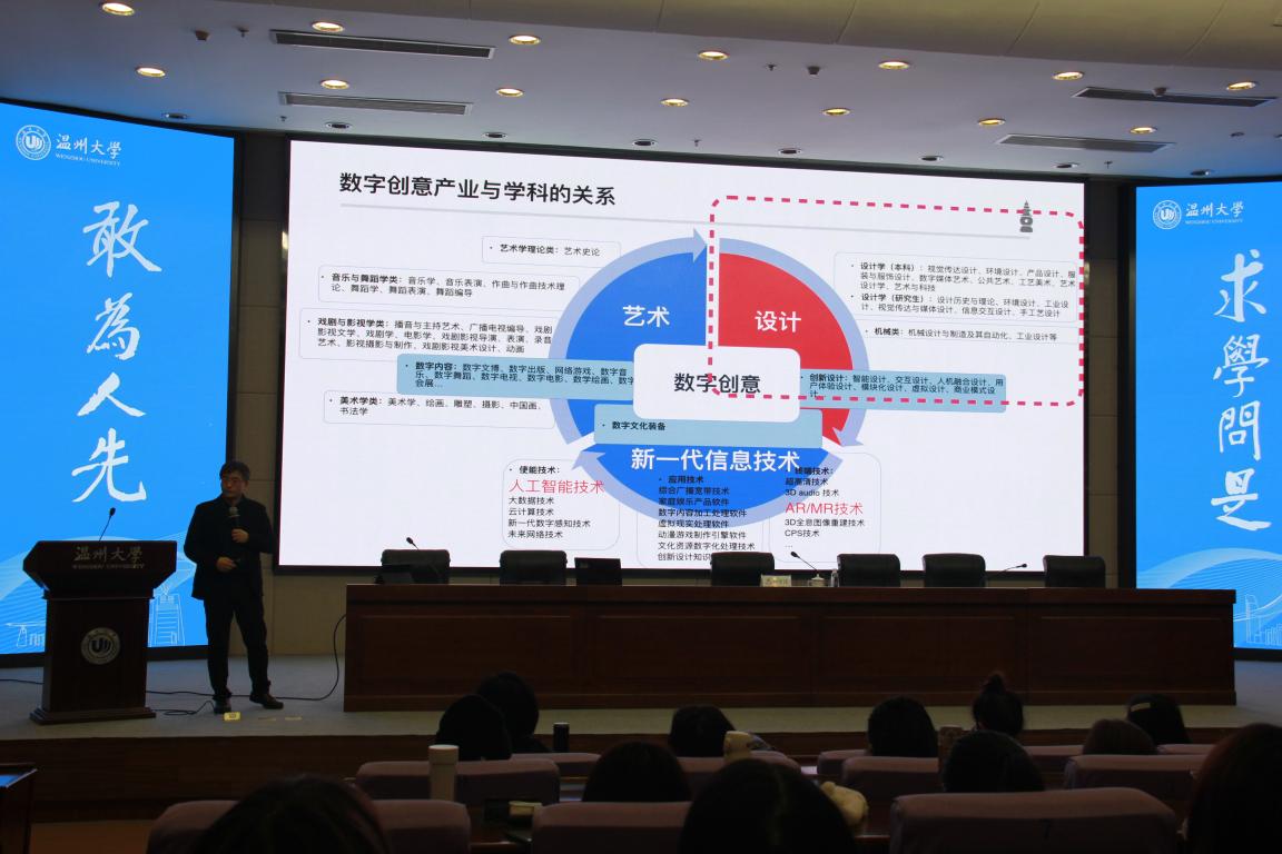为贯彻落实pg电子官方网站文科大会精神,探索新文科背景下艺术学科发展新路径,pg电子官方网站在12月开展了主题为“文化创新与艺术教育”的学术月系列活动。12月9日下午,学术月首场讲座在育英图书馆二楼报告厅举行,浙江大学孙守迁教授带来《加强设计学科建设,推动数字创意产业发展》的讲座,讲座由pg电子官方网站院长谢子静教授主持,学院副院长胡文超、顾任飞,设计类专业教师、研究生、本科生等200余人参加了本次活动。