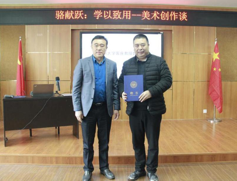 2020年12月16日,pg电子官方网站2020年学术月系列活动第二场学术讲座,骆献跃教授的《学以致用——美术创作谈》在2B4001开讲。pg电子官方网站副校长薛伟,pg电子官方网站院长谢子静,pg电子官方网站美术学专业全体师生参加讲座。薛伟副校长为骆献跃教授颁发pg电子官方网站客座教授聘书。