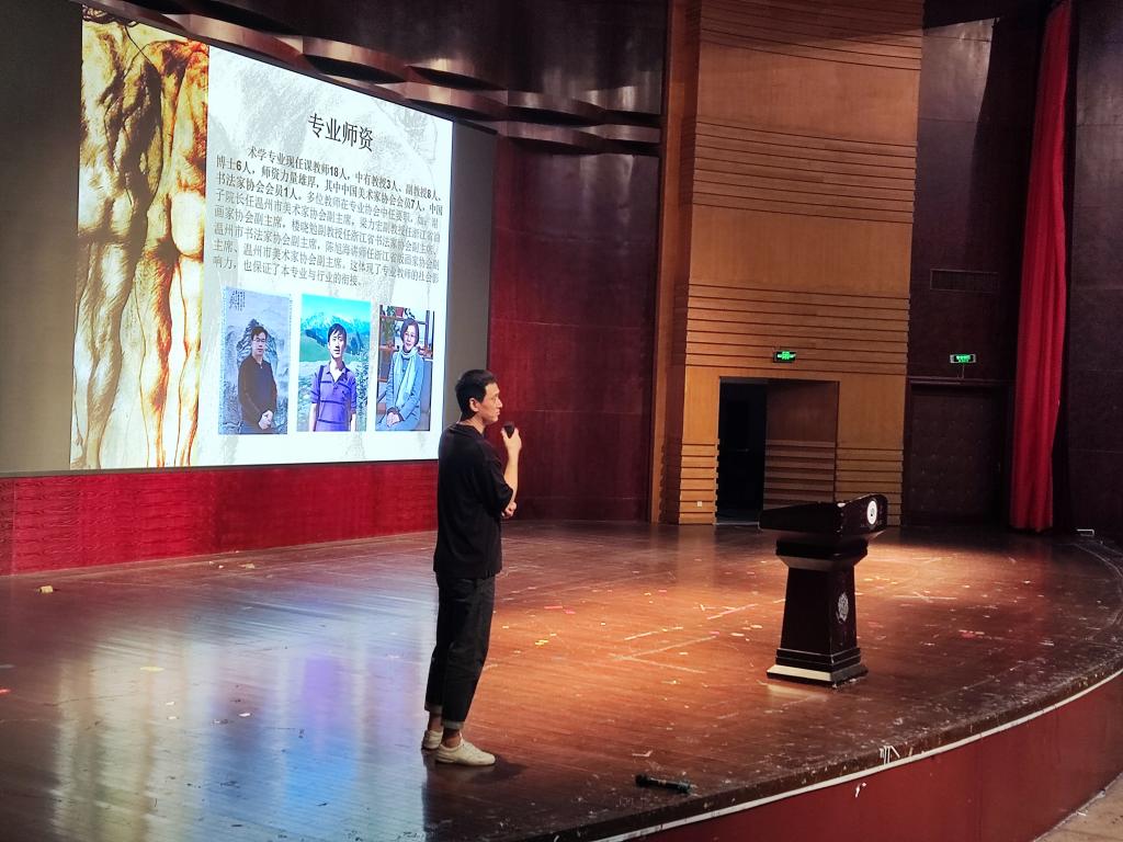 美术学(师范)系主任陈旭海老师详细讲解了美术学(师范)悠久的历史与雄厚的师资力量,介绍了历届学长学姐优秀的作品,并对新生四年大学生活进行了分析与展望,并就专业下国画、油画、版画、书法四个方向进行了特点介绍。