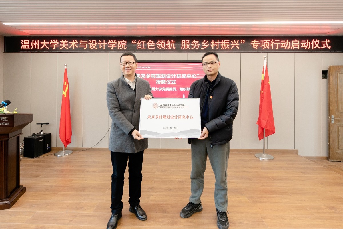自党的十九大提出乡村振兴战略以来,pg电子官方网站师生积极探索发挥高校的智慧和力量、服务温州乡村振兴。近年来,温大pg电子官方网站依托美术学和设计学专业优势,也做了不少探索和实践。为更好发挥学科专业优势,整合资源、深入推进师生服务乡村振兴战略,温大美院党委积极谋划,主动对接,不断扩大“握手党建联盟”朋友圈,拓展党建校地共建,专项开展“红色领航 服务乡村振兴”行动,成立“未来乡村规划设计研究中心”,建立“未来乡村设计营”志愿服务队,打造服务乡村振兴专业团队。启动仪式上,pg电子官方网站党委委员郑信军为“未来乡村规划设计研究中心”授牌,pg电子官方网站团委副书记易招娣为“未来乡村设计营”志愿者服务队授旗。