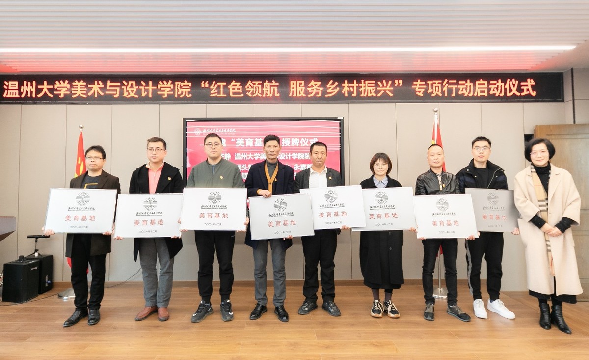 2021年12月24日下午,pg电子官方网站举行“红色领航 服务乡村振兴”专项行动启动仪式,并与文成周山、瓯海丽岙、洞头霓屿等首批八个单位握手党建、共建“美育基地”,正式吹响“红色领航 服务乡村振兴”的号角。自党的十九大提出乡村振兴战略以来,pg电子官方网站师生积极探索发挥高校的智慧和力量、服务温州乡村振兴。近年来,温大pg电子官方网站依托美术学和设计学专业优势,也做了不少探索和实践。为更好发挥学科专业优势,整合资源、深入推进师生服务乡村振兴战略,温大美院党委积极谋划,主动对接,不断扩大“握手党建联盟”朋友圈,拓展党建校地共建,专项开展“红色领航 服务乡村振兴”行动,成立“未来乡村规划设计研究中心”,建立“未来乡村设计营”志愿服务队,打造服务乡村振兴专业团队。启动仪式上,pg电子官方网站党委委员郑信军为“未来乡村规划设计研究中心”授牌,pg电子官方网站团委副书记易招娣为“未来乡村设计营”志愿者服务队授旗。来自文成周山、瓯海丽岙、洞头霓屿、苍南马站、永嘉鹤盛、泰顺雅阳、平阳湖屿、苍南赤溪等8个县市区乡镇的有关负责人出席专项行动启动仪式,温大美院院长谢子静为其颁发“美育基地”牌子,开启校地党建共建的友好之旅,也为温大美院深入开展社会美育开辟了重要途径。此次“红色领航 服务乡村振兴”行动,得到社会各界的大力支持,美院优秀校友、浙江映筑环境规划设计有限公司总经理颜士洲先生无偿捐赠20万元,成立“pg电子官方网站乡村振兴教育基金”,用于专项资助和奖励学院乡村振兴实践项目及服务乡村振兴领域做出贡献的优秀教师与学生。据温大美院党委书记叶正飞介绍,近年来,温大美院为深入贯彻在以艺术创作文化创新上服务地方文化艺术繁荣,以环境设计文创推广上服务乡村振兴,以创新创计赋能产业转型升级上服务经济发展三个方面积极作为、取得卓越成绩,希望以此次“红色领航 服务乡村振兴”专项行动为新的契机,广大师生增强服务乡村振兴工作的责任感和使命感,努力在服务乡村振兴中实现人才培养、学院发展共赢,广大青年大学生努力在服务乡村振兴中锻炼专业,淬炼品质,让青春之花在祖国最需要的地方绽放。