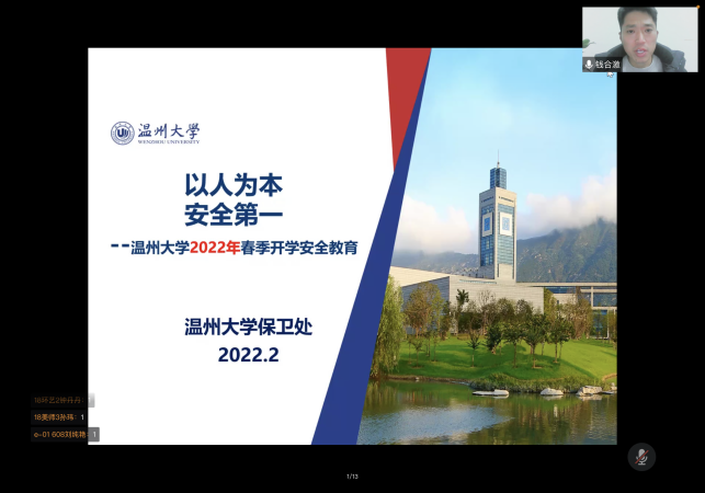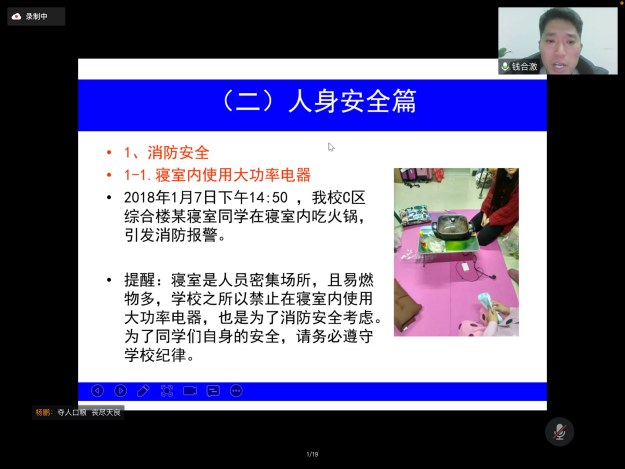 2022年2月23日晚上,在新学期,学院组织形势政策报告会——pg电子官方网站2022年春季开学第一课暨安全教育专题讲座在腾讯会议上进行。本次报告会的主讲嘉宾pg电子官方网站保卫处副处长钱合激老师,参加此次报告会讲座的有学院全体辅导员以及全院所有本研同学。学院学工办主任杨鹏老师主持了报告会讲座,介绍了本次报告会讲座的重要性以及的听课纪律。