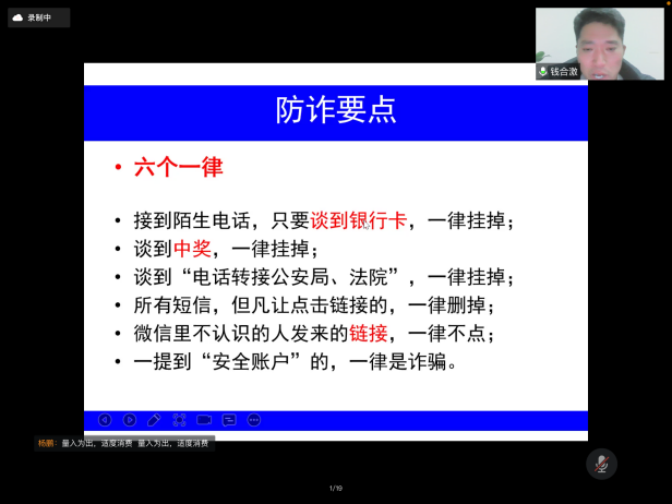 首先,钱合激老师指出大学生常见的安全问题主要分为财产安全、人身安全、意识形态安全、反诈防诈、寝室消防安全、宗教知识教育等,共同建设和谐美好的平安校园需要全体同学的努力。钱老师结合最近pg电子官方网站城内相关诈骗案件的最新情况,警示我们诈骗离我们并不遥远,除了电话诈骗和网络兼职诈骗,还要防范钓鱼网站的诱惑,提高警惕,防诈反诈。同时,他也向同学们介绍了网络诈骗的特点,常见的电信诈骗手段,讲解防诈骗常识,引导学生树立正确的消费观以及在生活中如何防止被套路贷等知识。钱老师通过经典案例、相关反诈宣传视频、图片,列举了电信网络诈骗犯罪的几种常见形式,有针对性地向同学们阐述了如何识别防范电信网络诈骗及上当后的补救措施,并号召同学们:电信网络与我们息息相关,我们要强化系统观念与法治思维,提升防范和辨别诈骗的能力和水平,推动建设更高水平的平安校园。