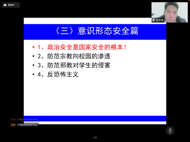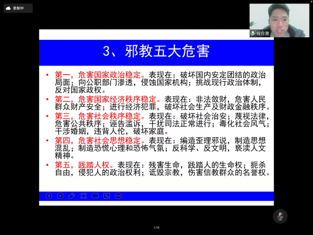 最后,钱合激老师为大家讲了意识形态安全,他提到大学时代是大学生“三观”及信仰形成的重要时期,稍有不慎,宗教组织便有机可乘。所以我们应该时刻保持清醒的头脑和政治警觉性,不能对宗教渗透的消极影响视而不见或放任自流。此外,很多人都认为邪教离我们很远,甚至觉得自己不可能被邪教蛊惑。但在现实生活中,邪教组织其实套路百出、无孔不入。他们常常借用各种唬人的幌子包装自己,不断更新骗人花样,稍有不慎可能就会跌入邪教圈套。