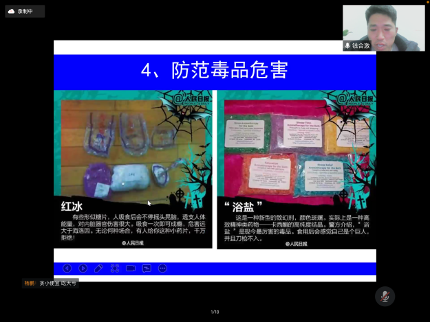其次,钱合激老师通过消防安全、交通安全、户外活动、毒品伤害四块内容来讲述大学生的人身安全。学生宿舍是高密度人群居住的地方,防火安全显得尤为重要,作为宿舍的主体——学生,要重视安全防火的重要性,提高思想认识,防范胜于救灾,责任重于泰山。同时,钱老师还提到毒品的危害,这些年由于国际毒品的泛滥,毒品像一头张开血盆大口的猛兽,正飞快吞噬着年轻的一代,它无情的破坏着我们的家庭和社会,导致多少家庭家破人亡,国家财富流失。就此,钱合激老师向大家呼吁:人的生命只有一次,它是无价的,也是脆弱的,它承载着你的亲人、朋友和整个社会赋予你的责任,它承受不起任何不负责任的冒险,所以我们一定要珍惜生命,远离毒品。