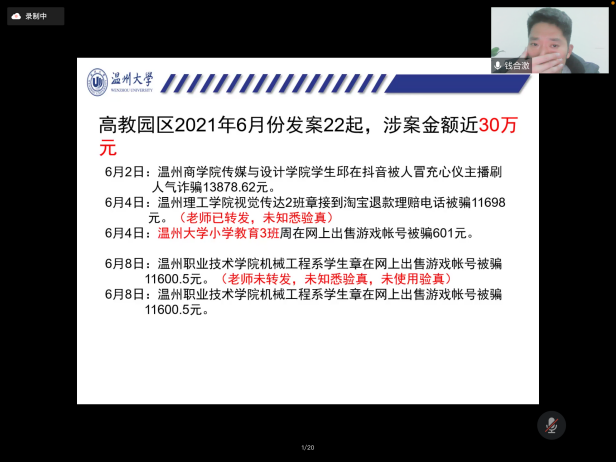 2022年2月23日晚上,在新学期,学院组织形势政策报告会——pg电子官方网站2022年春季开学第一课暨安全教育专题讲座在腾讯会议上进行。本次报告会的主讲嘉宾pg电子官方网站保卫处副处长钱合激老师,参加此次报告会讲座的有学院全体辅导员以及全院所有本研同学。学院学工办主任杨鹏老师主持了报告会讲座,介绍了本次报告会讲座的重要性以及的听课纪律。 首先,钱合激老师指出大学生常见的安全问题主要分为财产安全、人身安全、意识形态安全、反诈防诈、寝室消防安全、宗教知识教育等,共同建设和谐美好的平安校园需要全体同学的努力。钱老师结合最近pg电子官方网站城内相关诈骗案件的最新情况,警示我们诈骗离我们并不遥远,除了电话诈骗和网络兼职诈骗,还要防范钓鱼网站的诱惑,提高警惕,防诈反诈。同时,他也向同学们介绍了网络诈骗的特点,常见的电信诈骗手段,讲解防诈骗常识,引导学生树立正确的消费观以及在生活中如何防止被套路贷等知识。钱老师通过经典案例、相关反诈宣传视频、图片,列举了电信网络诈骗犯罪的几种常见形式,有针对性地向同学们阐述了如何识别防范电信网络诈骗及上当后的补救措施,并号召同学们:电信网络与我们息息相关,我们要强化系统观念与法治思维,提升防范和辨别诈骗的能力和水平,推动建设更高水平的平安校园。 其次,钱合激老师通过消防安全、交通安全、户外活动、毒品伤害四块内容来讲述大学生的人身安全。学生宿舍是高密度人群居住的地方,防火安全显得尤为重要,作为宿舍的主体——学生,要重视安全防火的重要性,提高思想认识,防范胜于救灾,责任重于泰山。同时,钱老师还提到毒品的危害,这些年由于国际毒品的泛滥,毒品像一头张开血盆大口的猛兽,正飞快吞噬着年轻的一代,它无情的破坏着我们的家庭和社会,导致多少家庭家破人亡,国家财富流失。就此,钱合激老师向大家呼吁:人的生命只有一次,它是无价的,也是脆弱的,它承载着你的亲人、朋友和整个社会赋予你的责任,它承受不起任何不负责任的冒险,所以我们一定要珍惜生命,远离毒品。 最后,钱合激老师为大家讲了意识形态安全,他提到大学时代是大学生“三观”及信仰形成的重要时期,稍有不慎,宗教组织便有机可乘。所以我们应该时刻保持清醒的头脑和政治警觉性,不能对宗教渗透的消极影响视而不见或放任自流。此外,很多人都认为邪教离我们很远,甚至觉得自己不可能被邪教蛊惑。但在现实生活中,邪教组织其实套路百出、无孔不入。他们常常借用各种唬人的幌子包装自己,不断更新骗人花样,稍有不慎可能就会跌入邪教圈套。 “你的平安,是对家人最好的关爱!”生命只有在安全中才能永葆活力,幸福只有在安全中才能永具魅力。安全构筑了我们美好的家园,在安全的问题上,来不得半点麻痹和侥幸,我们必须防范在先、警惕在前;必须要树立高度的安全意识,人人讲安全,时时讲安全,推动建设更高水平的平安校园。