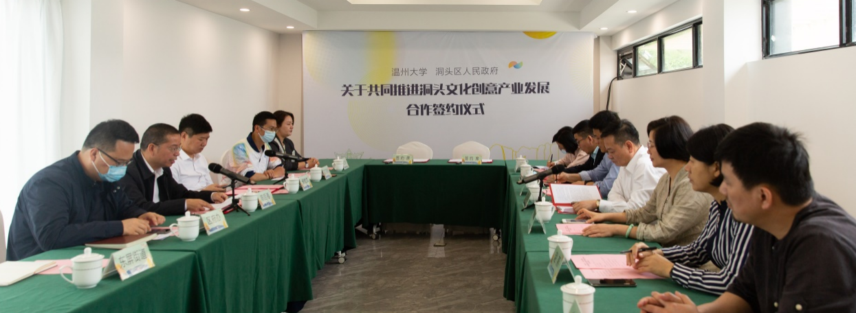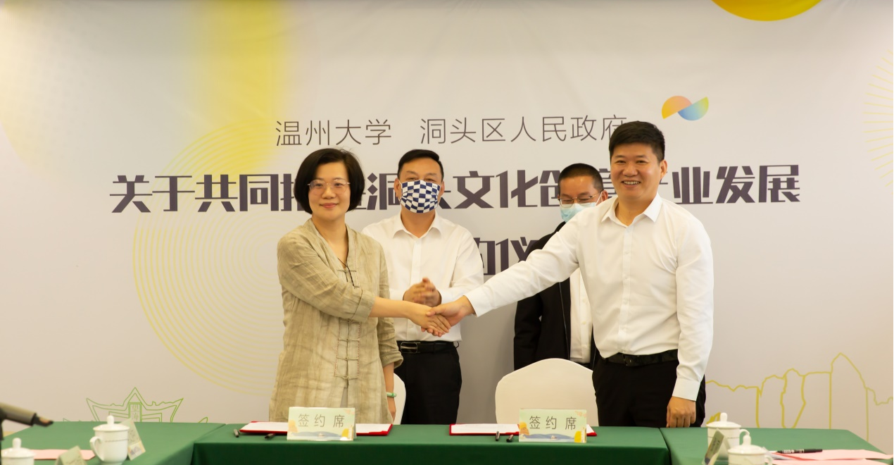 5月26日上午,温州市洞头区人民政府 pg电子官方网站关于共同推进洞头文化创意产业发展合作签约仪式在洞头区文创中心顺利举行,pg电子官方网站党委委员、副校长潘玉驹,洞头区人大副主任陈后春、副区长贾约拿、文广旅体局副局长林慷慨、东屏街道相关负责人以及半屏文创中心负责人,pg电子官方网站教务处副处长赵燕、pg电子官方网站院长谢子静、党委书记叶正飞、副院长胡文超、视觉传达系主任刘俊、办公室主任张丽出席活动。活动由贾约拿副区长主持。