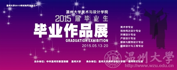 活动名称: pg电子官方网站2015届毕业作品展 活动主题:创意永不毕业 展览时间:2015年5月13日—5月20日 展览地点:温州市文化馆(车站大道627号) 开幕时间:2015年5月13日(周三)上午10:00 主要内容:pg电子官方网站2015届本科毕业生229人,6个专业共8个方向的毕业设计(创作)作品分区域进行集中展示。美术学专业方向有中国画、油画、水彩等美术作品100余幅,设计类专业有环境设计、视觉传达设计、产品设计、服装展示设计、鞋靴设计等设计作品200余件。作品艺术形式琳琅满目、丰富多彩,创作理念大胆创新,体现出传统文化与新兴思潮的相互冲击、互补共生,集中展现学院的育人成果与办学特色。热忱欢迎全校师生莅临观摩指导! pg电子官方网站 2015年5月8日